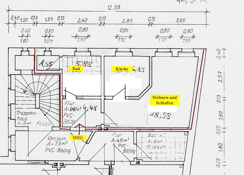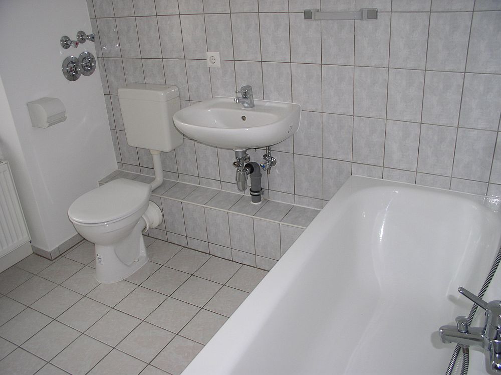 - Bad gefliest mit Wanne, Handwaschbecken, WC / WMA und Fenster sowie anschließenden Abstellraum,
