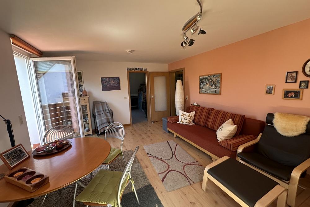 - Wohnzimmer mit Laminatboden und Zugang auf d. Balkon,