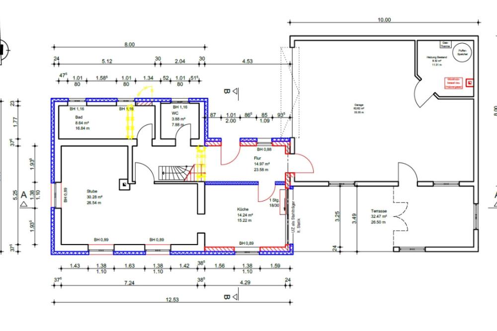 Raumaufteilung: Erdgeschoss: Eingangsbereich – Flur, Wohnzimmer mit offener Küche, Küche mit