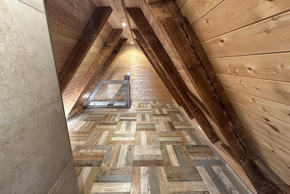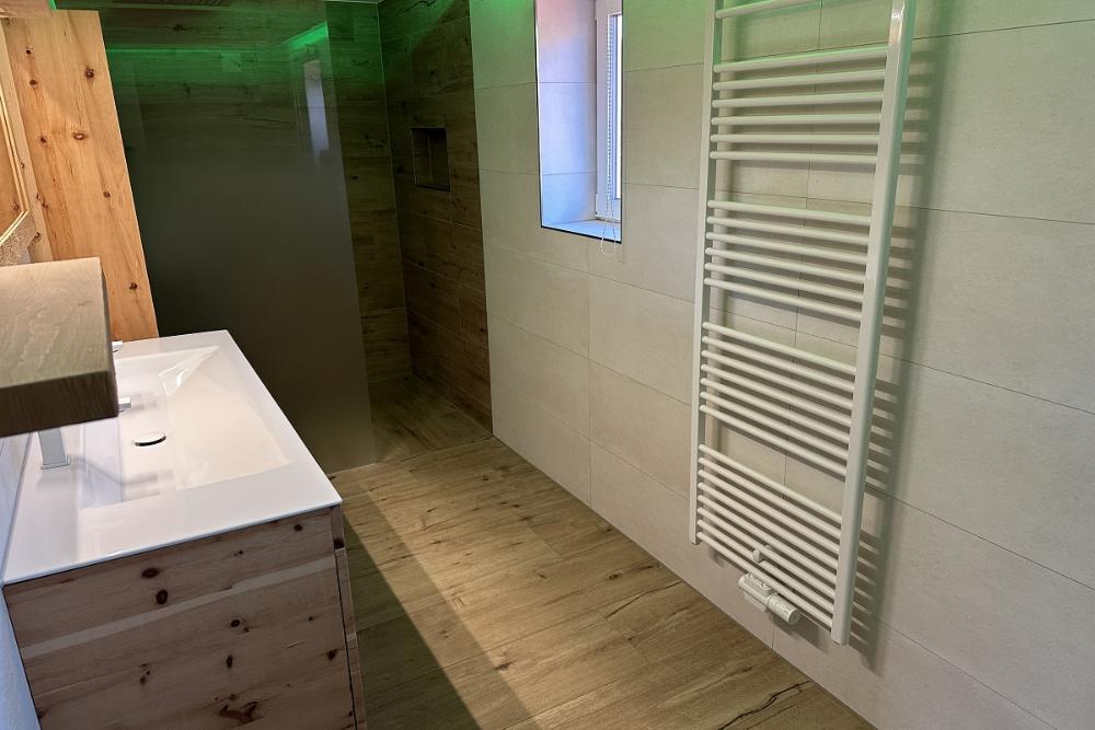 EG mit großer Dusche und Zirbenmöbeln, das EG wird über eine Fußbodenheizung und einen