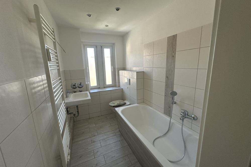 - Bad gefliest mit Wanne, Handwaschbecken, Sprossenheizkörper, Fenster und WC
