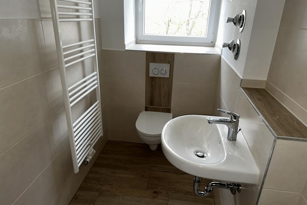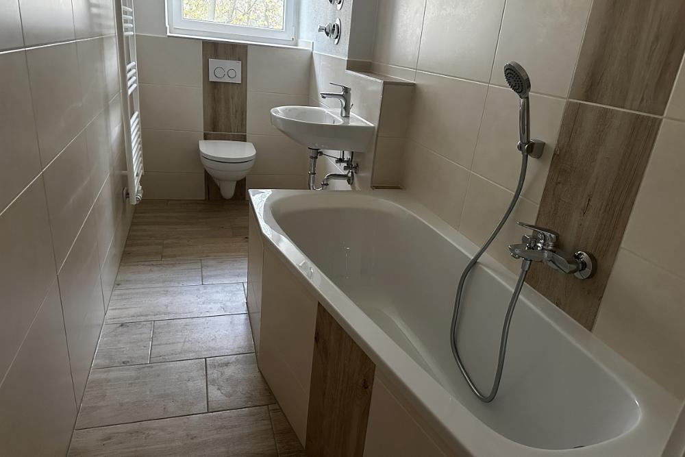 - komplett neue Badausstattung mit Wanne, Handwaschbecken, Badheizkörper, WC und Fenster, Bad neu gefliest