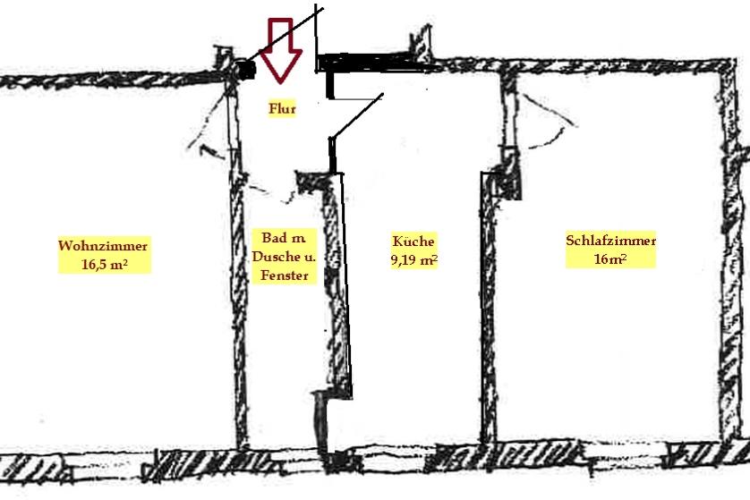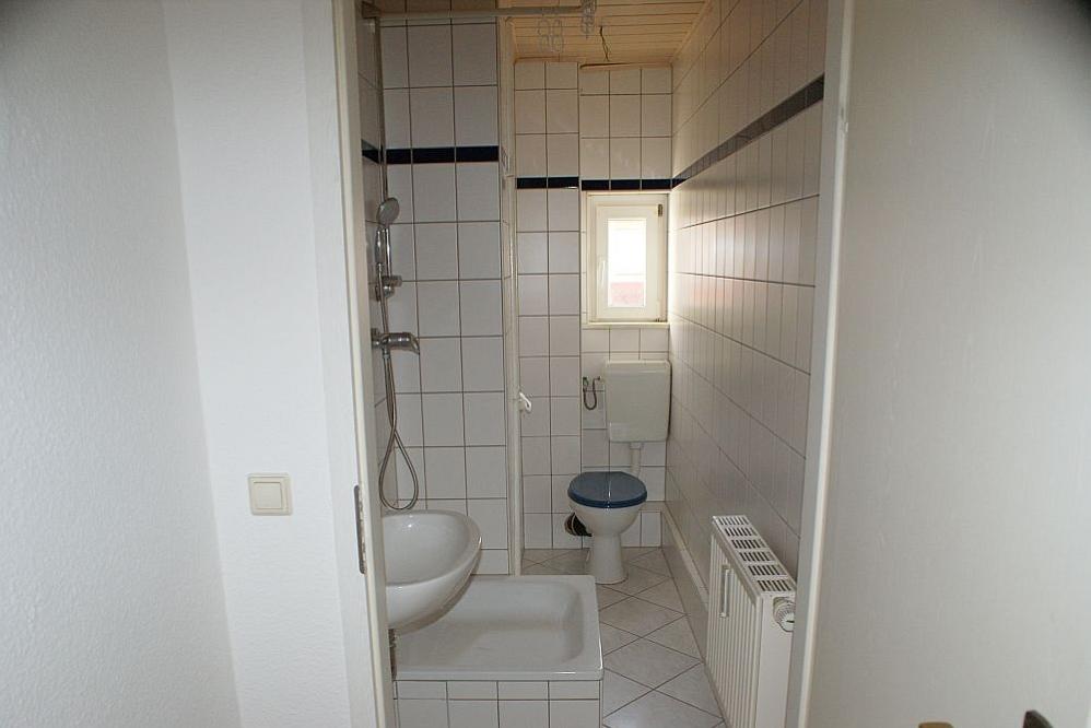 - Bad gefliest mit Dusche, Handwaschbecken, WC und Fenster