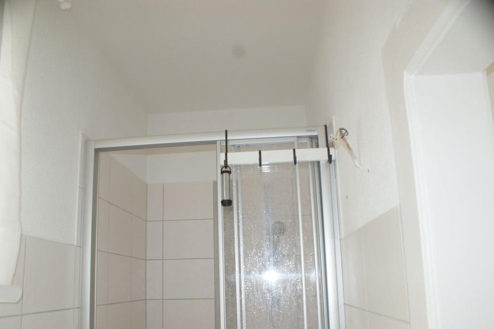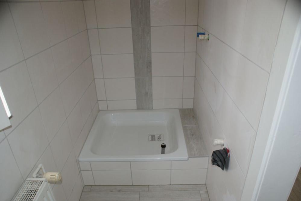 - Bad gefliest und mit großer Dusche, Handwaschbecken und Hänge-WC sowie Fenster
