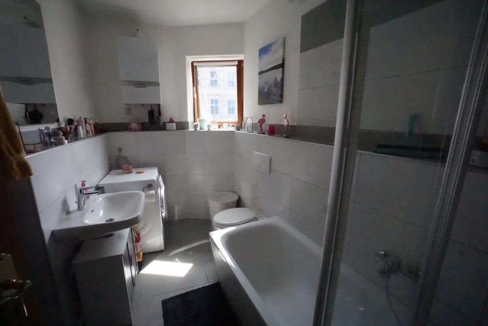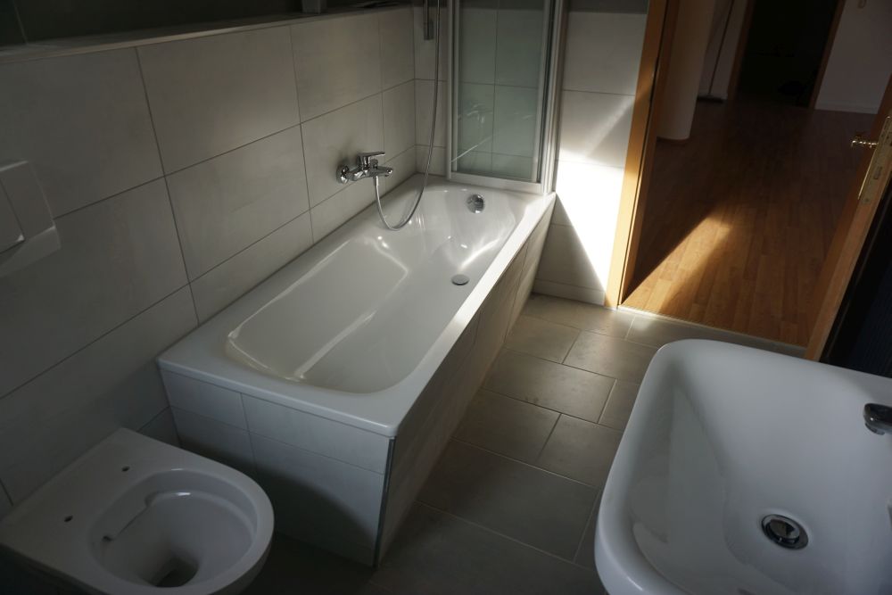 - neu gefliestes Bad mit Wanne, Handwaschbecken, moderner Badheizkörper, WC und WMA sowie Fenster