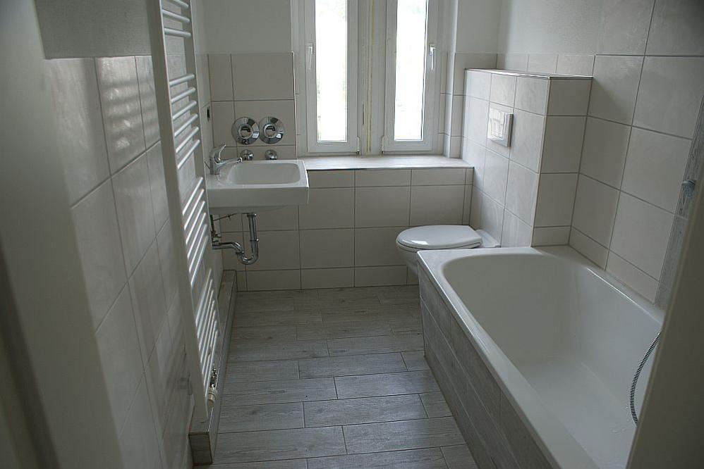 - Bad gefliest mit Wanne, Handwaschbecken und WC